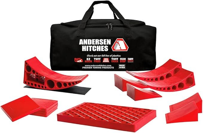 The Andersen Hitches Ultimate Trailer Gear Duffel Bag is a complete RV leveling and accessory kit designed to make campsite setup easy. The set includes everything you need for leveling your camper, all stored in one durable carry bag with handles.